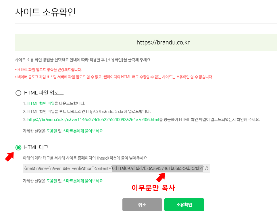 등록중인 네이버웹마스터 도구에서 사이트 소유확인을 누르시면 소유확인 완료 메시지가 나오면 정상적으로 등록이 완료된 것입니다. 만일 메시지가 나오지 않으면 위의 순서대로 다시한번 천천히 해보세요.