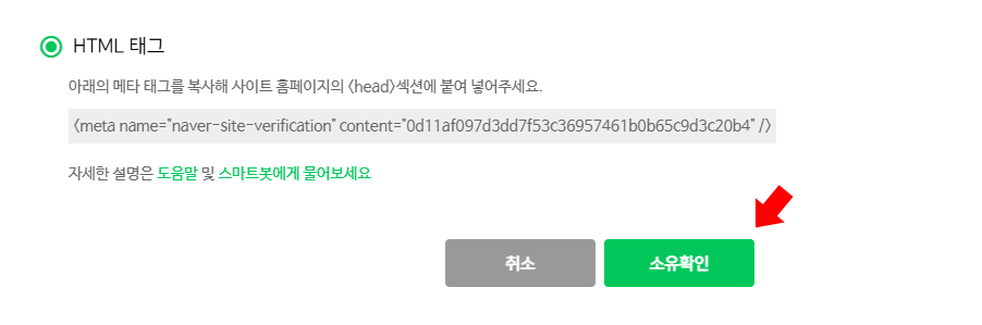 등록중인 네이버웹마스터 도구에서 사이트 소유확인을 누르시면 소유확인 완료 메시지가 나오면 정상적으로 등록이 완료된 것입니다. 만일 메시지가 나오지 않으면 위의 순서대로 다시한번 천천히 해보세요.